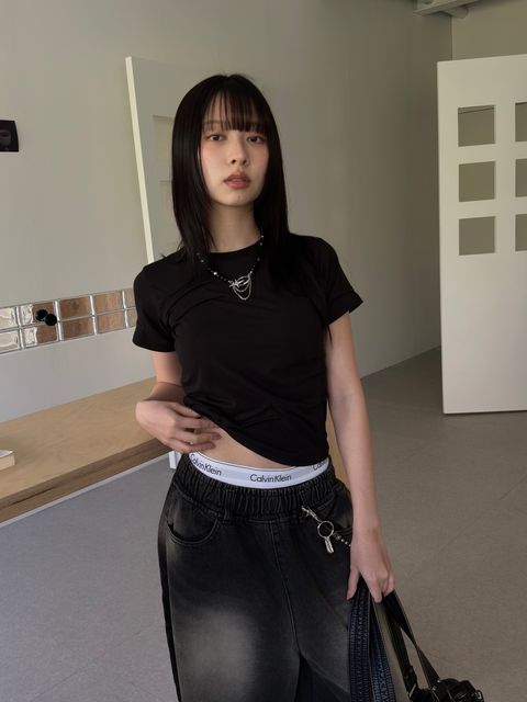 墜弱天使 水洗落肩短袖/黑